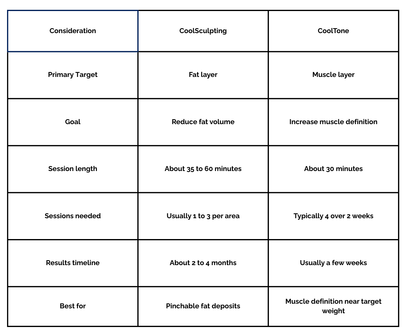 Both treatment options are non-invasive and require no downtime, but they approach body contouring differently. The table below summarizes these differences for a general overview.